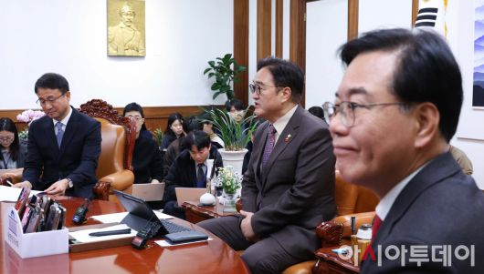 아시아투데이 이병화 기자 = 우원식 국회의장(가운데)과 한병도 더불어민주당 원내대표(왼쪽), 송언석 국민의힘 원내대표가 14일 서울 여의도 국회 의장실에서 여야 원내대표 회동을 하고 있다. ⓒ "젊은 파워, 모바일 넘버원 아시아투데이"