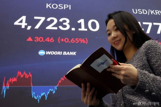 (서울=뉴스1) 황기선 기자 = 코스피 지수가 사상 처음으로 4700선을 돌파한 14일 오후 서울 중구 우리은행 본점 딜링룸 현황판에 종가가 표시되고 있다. 이날 코스피는 전 거래일 대비 30.46포인트(0.65%)상승한 4,723.10 스닥은 6.80포인트(0.72%) 내린 942.18로 장을 마쳤다. 2026.1.14/뉴스1 Copyright (C) 뉴스1. All rights reserved. 무단 전재 및 재배포, AI학습 이용 금지. /사진=(서울=뉴스1) 황기선 기자 |