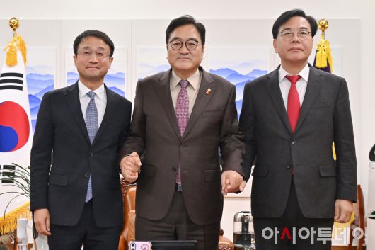 아시아투데이 이병화 기자 = 우원식 국회의장(가운데)과 한병도 더불어민주당 원내대표(왼쪽), 송언석 국민의힘 원내대표가 14일 서울 여의도 국회 의장실에서 열린 여야 원내대표 회동에서 기념촬영을 하고 있다. ⓒ "젊은 파워, 모바일 넘버원 아시아투데이"