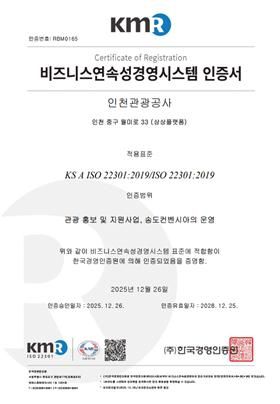유지상 인천관광공사 사장은 “이번 통합인증은 공사의 재난 대응과 안전보건 관리체계가 국제 기준에 부합함을 객관적으로 인정받은 결과”라며 “앞으로도 시민과 관광객이 안심할 수 있는 관광환경 조성을 위해 예방 중심의 안전·연속성 경영을 지속적으로 강화해 나가겠다”고 말했다.