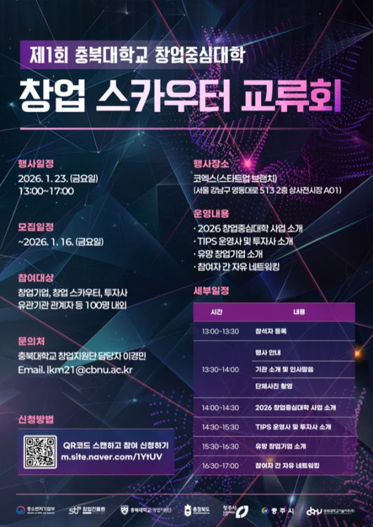 충북대학교가 주최하고 슘페터가 운영하는 '제1회 충북대학교 창업중심대학 창업 스카우터 교류회'가 오는 23일 오후 코엑스(스타트업 브랜치) 2층 상사전시장 A01에서 개최된다. 이번 교류회는 창업기업, 창업 스카우터, 투자사, 유관기관 관계자 등 100명 내외가 참여하는 네트워킹 행사로, 창업 현장에서 실제로 필요한 연결과 후속 협력의 기회를 만드는 데 초점을 맞췄다.