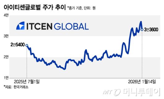 14일 한국거래소(KRX)에서 아이티센글로벌은 3만3600원에 거래를 마쳤다. 연초 이후 10.9% 상승했고, 최근 1년간 상승률은 555.0%에 달한다. 주가는 전날 52주 신고가를 경신, 이날 차익실현성 매물이 몰리면서 9.19% 급락 마감했지만 종가는 3거래일 전 수준을 웃돌았다. 올 들어 급등을 거듭했다.