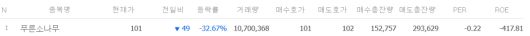반면 푸른소나무는 전 거래일 대비 32.67%(49원) 하락한 101원에 거래를 마치며 하한가를 기록했다. 전날부터 정리매매에 들어간 영향이다.