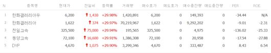 14일 코스피 시장에서는 한화갤러리아우, 한화갤러리아, 천일고속, 동양고속, DYP 등 5개 종목이 상한가를 기록했다. 하한가 종목은 없었다.
