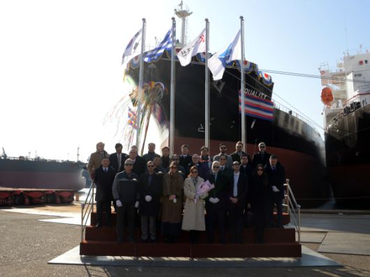 진해 케이조선에서 5만 톤 급 석유화학제품운반선에 대한 명명식이 진행되고 있다. [사진=케이조선] |