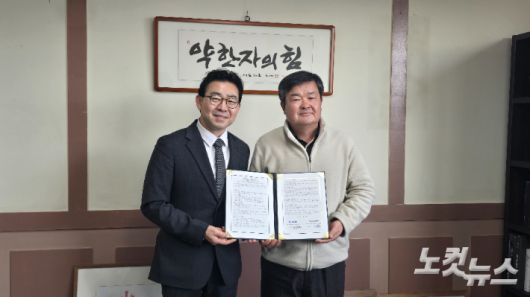 14일 경남도민일보에서 열린 홍보 업무 협약식에서 경남CBS 이종성 대표(사진 왼쪽)과 경남도민일보 임용일 대표이사가 협약서에 서명했다. 이상현 기자 |