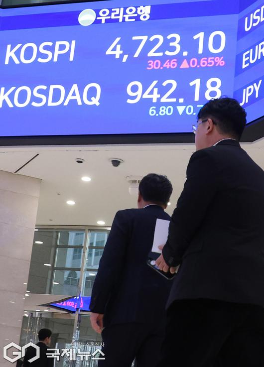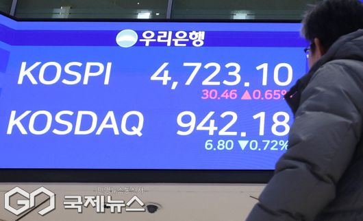 (서울=국제뉴스) 코스피가 사상 첫 4700선을 넘은 14일 서울 중구 우리은행 본점 1층 로비 전광판에 코스피 지수가 표시 돼 있다. 이날 코스피는 전 거래일(4692.64)보다 30.46포인트(0.65%) 상승한 4723.10에, 코스닥 지수는 전 거래일(948.98)보다 6.80포인트(0.72%) 내린 942.18에 거래를 마쳤다.서울 외환시장에서 원·달러 환율은 전 거래일(1473.7원)보다 3.8원 오른 1477.5원에 주간 거래를 마감했다./사진=이용우 기자