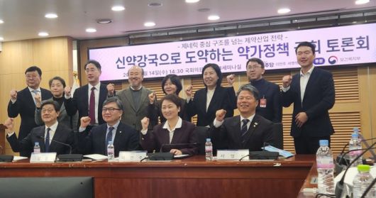 14일 이언주·서영석·김윤 더불어민주당 의원이 국회에서 개최한 '신약강국으로 도약하는 약가정책' 토론회에서 참석자들이 기념촬영하고 있다./사진= 박미주 기자 |
