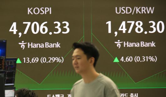 14일 서울 중구 하나은행 본점 딜링룸에서 직원이 증시와 환율을 모니터하고 있다. 이날 코스피는 7.53p(0.16%) 내린 4685.11로 개장해 상승전환, 장중 사상 첫 4700선을 돌파했다. 연합뉴스 |
