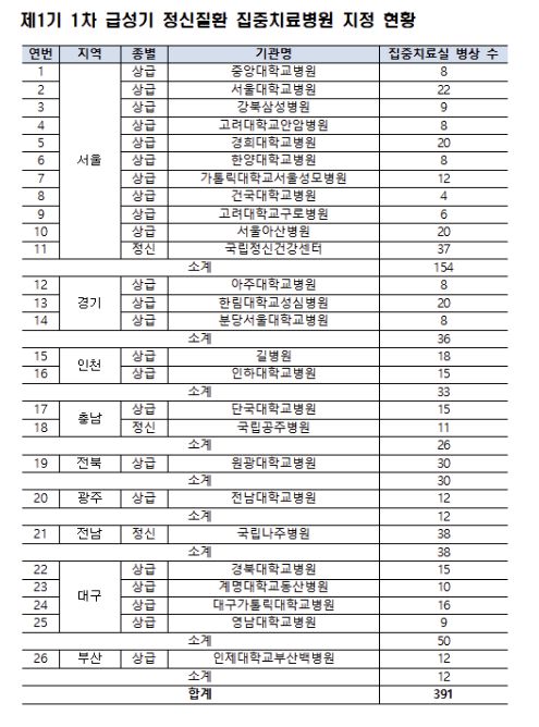 이번 1차 지정은 상급종합병원 47개소와 국립정신병원 5개소를 대상으로 공모를 진행해, 상급종합병원 23개소(305병상)와 국립정신병원 3개소(86병상)를 집중치료병원 및 집중치료실 병상으로 지정했다.