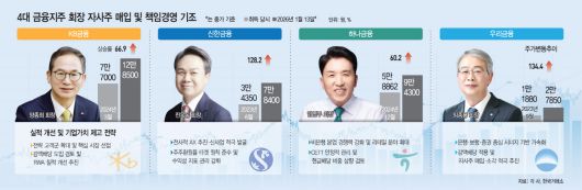 14일 금융권에 따르면 4대 금융지주 회장들이 취임 이후 책임경영과 기업 펀더멘털 강화 노력 일환으로 매입한 자사주에서 발생한 평가차익은 총 8억1464만원에 달하는 것으로 나타났다. 취득 시점에는 차이가 있지만, 최근 금융주 전반의 강세 흐름 속에서 큰 폭의 평가차익이 발생했다는 점은 공통적이다.