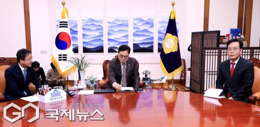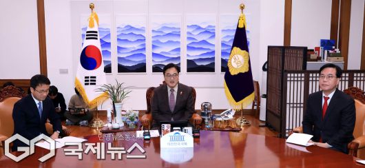 (서울=국제뉴스) 우원식 국회의장(가운데)과 한병도 더불어민주당 원내대표(왼쪽), 송언석 국민의힘 원내대표가 14일 서울 여의도 국회 의장실에서 여야 원내대표 회동을 하고 있다./사진=이용우 기자