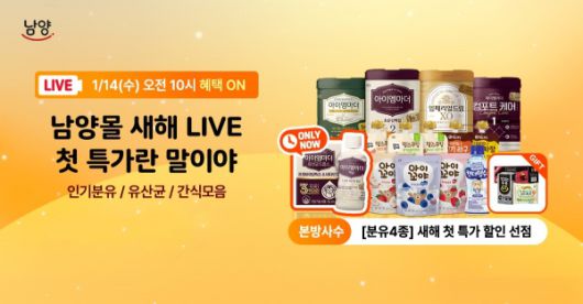 '건강한 시작' 남양유업이 새해를 맞아 14일 오전 10시 자사몰 '남양몰'에서 '새해 LIVE 첫 특가’ 프로모션을 진행한다고 14일 밝혔다. 이번 라이브 방송은 인기 조제분유와 아기 간식 등 주요 제품을 최대 68% 할인된 가격에 선보인다.