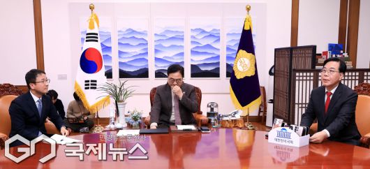 (서울=국제뉴스) 우원식 국회의장(가운데)과 한병도 더불어민주당 원내대표(왼쪽), 송언석 국민의힘 원내대표가 14일 서울 여의도 국회 의장실에서 여야 원내대표 회동을 하고 있다./사진=이용우 기자