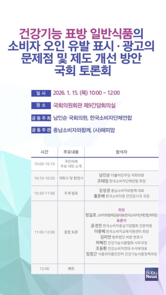 더불어민주당 남인순 국회의원(서울 송파구병)과 한국소비자단체연합(회장 조태임)은 1월 15일 오전 10시 국회의원회관 제9간담회의실에서 "건강기능 표방 일반식품의 소비자 오인 유발 표시·광고의 문제점 및 제도개선 방안 국회토론회"를 공동 주최하며, 충남소비자와함께 및 해피맘이 공동 주관한다고 14일 밝혔다.