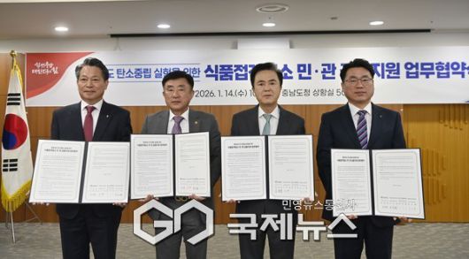 김태흠 지사는 14일 도청 상황실에서 오주현 NH농협은행 충남본부장, 윤석용 한국외식업중앙회 충남도지회장, 조소행 충남신용보증재단 이사장과 식품접객업소 민관 금융 지원 업무협약을 체결했다.