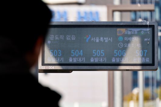 서울 시내버스 무기한 전면파업 이틀 차인 14일 서울역 버스환승센터 정류장 전광판에 버스 도착 시간이 ‘출발대기’ 및 ‘곧도착 없음’으로 표시되고 있다. [연합뉴스] |