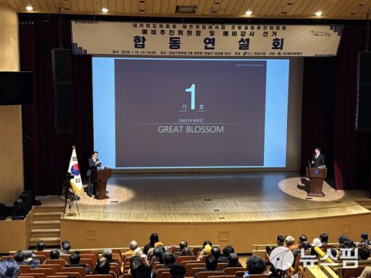 [서울=뉴스핌] 조수민 기자 = 14일 개최된 '대치미도 아파트 재건축정비사업 조합설립추진위원회 예비추진위원장 및 예비 감사 선거 합동연설회'에서 이석주 미도통합재건축연합회 위원장이 공약을 발표하고 있다. 2026.01.14 blue99@newspim.com |