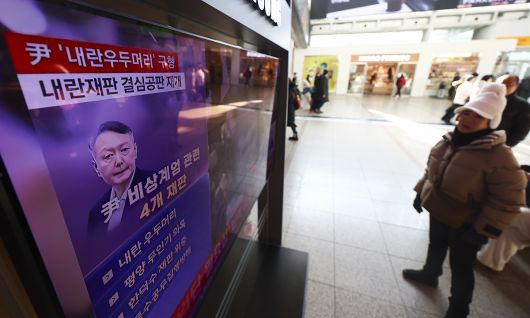윤석열 전 대통령의 내란 우두머리 혐의 재판을 마무리하는 결심 절차가 재개된 지난 13일 서울역 대합실에서 시민이 관련 뉴스를 시청하고 있다. 뉴시스 |