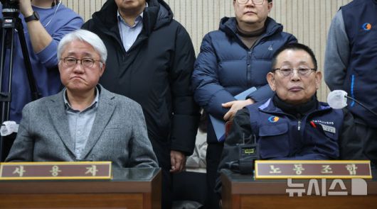 [서울=뉴시스] 황준선 기자 = 서울시버스노동조합 파업 이틀차인 14일 오후 박점곤(오른쪽) 전국자동차노동조합연맹 서울시버스노동조합 위원장과 김정환 서울시버스운송사업조합 이사장이 서울 영등포구 서울지방노동위원회에서 열린 노사 교섭에 참석해 있다. 2026.01.14. hwang@newsis.com |