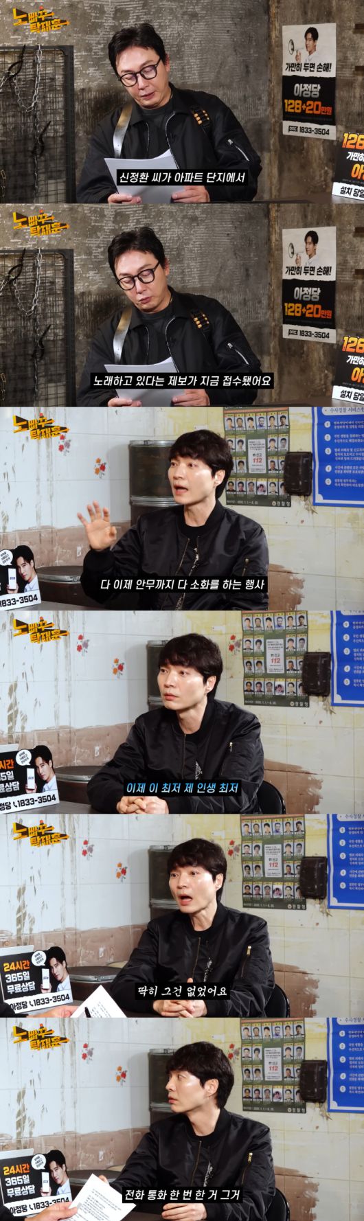 탁재환은 신정환에게 "나름 활동을 하고 있더라. 아파트 단지에서 노래하고 있다는 제보가 접수됐다"라며 사진을 보여줬다. 사진 속 신정환은 한 아파트 내 무대에 올라 열심히 춤을 추고 노래를 부르고 있었다.