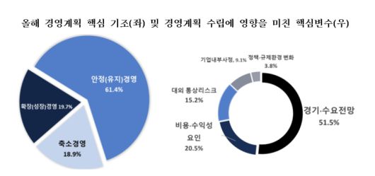 이 같은 인식은 실적 목표에도 반영됐다. 지난해 대비 내수와 수출 목표를 ‘지난해 수준으로 유지’하겠다는 응답이 각각 40.5%, 40.9%로 가장 높게 나타났다. 경영계획 수립에 가장 큰 영향을 미친 요인으로는 ‘경기·수요 전망’이 51.5%로 1순위를 차지했고 ‘비용·수익성’(20.5%), ‘대외 통상 리스크’(15.2%)가 뒤를 이었다.
