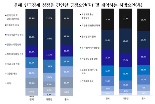 반면 성장 기대 요인으로는 ‘금리 인하 및 금융여건 완화’(21.8%)와 ‘수출 호조 지속’(20.9%)이 상위에 올랐다. 중소기업은 금리 인하 효과를, 대·중견기업은 수출 개선 가능성에 더 큰 기대를 보였다.