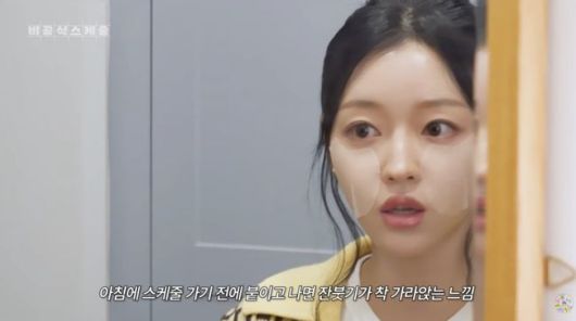 그는 이어 "아침에 일어나 스케줄 가기 전에 패드를 붙이면 붓기가 가라앉는 것 같다. 눈 밑에 붙여준다"라며 실제 사용 중이라는 스킨 패드를 얼굴에 얹었다. 그 순간 제작진 사이 탄성이 쏟아졌다. 스킨 패드 한 장에 유아의 볼 한 쪽이 다 가려졌기 때문.