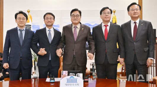 [서울=뉴시스] 김금보 기자 = 우원식 국회의장이 14일 서울 여의도 국회에서 여야 원내대표단과 기념촬영을 하고 있다. 왼쪽부터 더불어민주당 천준호 원내운영수석부대표와 한병도 원내대표, 우원식 국회의장, 국민의힘 송언석 원내대표와 유상범 원내운영수석부대표. (공동취재) 2026.01.14. kgb@newsis.com |