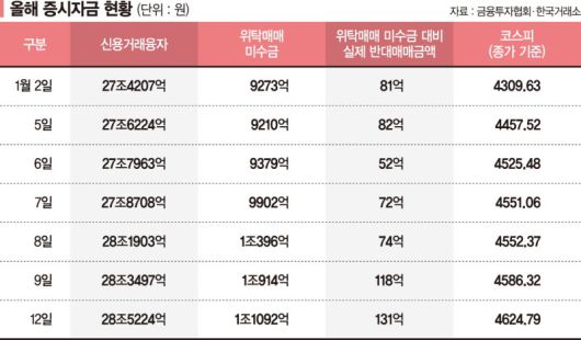 새해 들어 증시가 '초강세'를 보이자 공격적인 투자세가 늘어났다. 코스피는 지난 2일부터 이날까지 12.07% 상승했다. 빚투는 통상 주가 상승이 예상될 때 늘어나고 하락장에는 줄어든다.