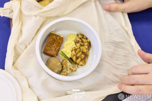 [서울=뉴스핌] 김혜경 여사가 지난 13일 일본 나라컨벤션센터에서 재일 한국계 예술인과 간담회를 열었다. 김 여사가 준비한 다과. [사진=청와대] 2026.01.14 photo@newspim.com