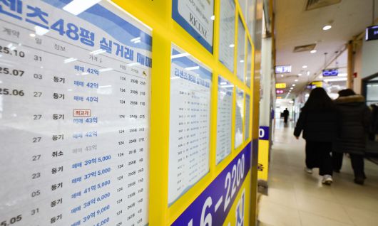 서울 시내 한 부동산에 게시된 대형 평수 아파트 매매 실거래가 표의 모습. 뉴시스 |