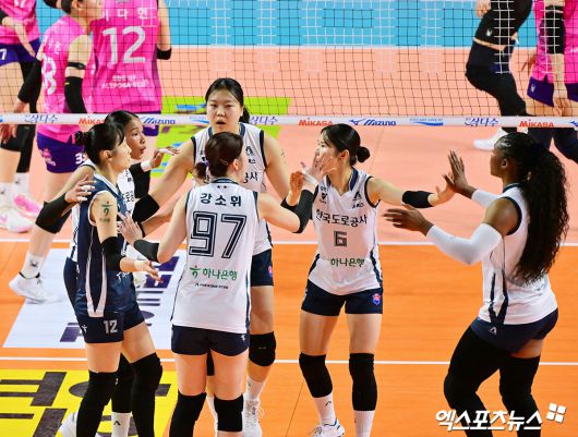 (엑스포츠뉴스 인천, 김한준 기자) 14일 오후 인천 부평구 삼산월드체육관 열린 '진에어 2025-2026 V-리그' 흥국생명과 한국도로공사의 경기, 도로공사 선수들이 득점 후 기뻐하고 있다.김한준 기자 kowel@xportsnews.com