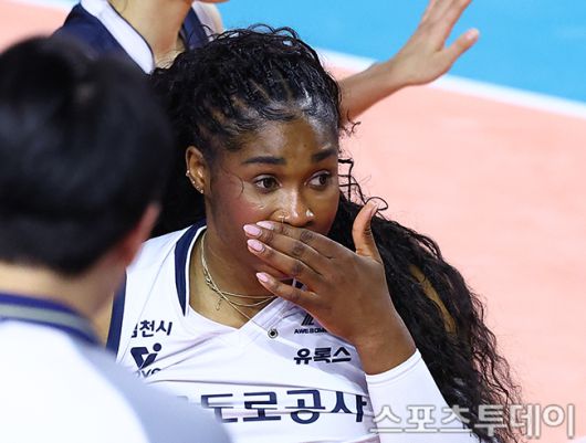 [인천=스포츠투데이 팽현준 기자] 14일 인천 삼산월드체육관에서 열린 2025-2026 V리그 여자부 흥국생명과 한국도로공사의 경기, 한국도로공사 모마가 경기중 얼굴에 공을 맞고 있다. 2026.01.14. [스포츠투데이 팽현준 기자 sports@stoo.com]