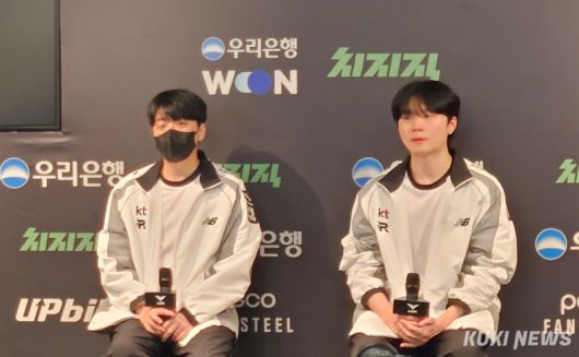 왼쪽부터 고동빈 KT 롤스터 감독과 ‘비디디’ 곽보성이 14일 서울 종로구 치지직 롤파크에 위치한 LCK 아레나에서 열린 DN 수퍼스와의 ‘2026 LCK컵’ 경기가 끝난 뒤 기자회견에 참석하고 있다. 송한석 기자 |
