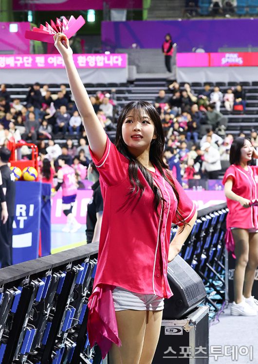 [인천=스포츠투데이 팽현준 기자] 14일 인천 삼산월드체육관에서 열린 2025-2026 V리그 여자부 흥국생명과 한국도로공사의 경기, 흥국생명 최석화 치어리더가 응원을 하고 있다. 2026.01.14. [스포츠투데이 팽현준 기자 sports@stoo.com]