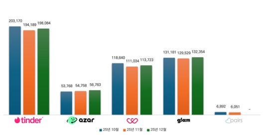 관련 데이터에서 가장 흥미로운 지점은 모든 플랫폼이 공통적으로 겪은 '11월의 하락세'다. 틴더·위피·글램 등 상위권 앱들은 11월에 일제히 이용자 수가 감소했다. 업계에서는 이를 계절적 비수기와 더불어 하반기 공채 및 각종 시험 등 사회적 일정에 따른 일시적 현상으로 보고 있다.
