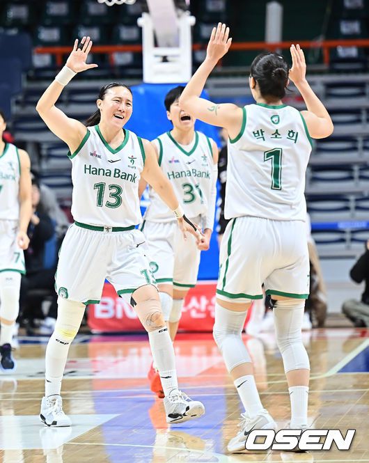 부천 하나은행 김정은이 4쿼터 16.6초 남기고 역전 3점슛을 성공시킨 박소희와 하이파이브를 하고 있다. 2025.12.19 / foto0307@osen.co.kr