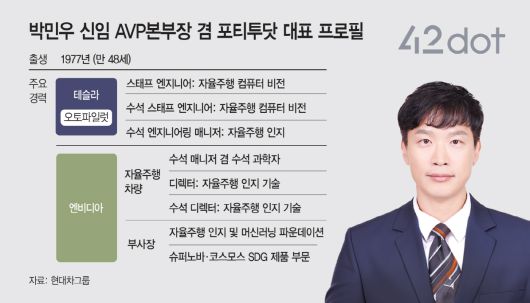 현대자동차그룹이 박민우 박사를 영입했다. 신임 AVP본부장 겸 포티투닷(42dot) 대표로 선임한 것이다. 그는 엔비디아와 테슬라 등에서 자율주행 기술 개발과 상용화를 거둔 성과가 있다는 평가를 받았다. 이 같은 기술 리더십을 바탕으로 소프트웨어중심차(SDV)와 자율주행 경쟁력을 강화하고, 중장기적으로는 기술 내재화에 속도를 낼 전망이다.