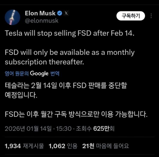 일론 머스크는 14일(현지시간) 자신의 소셜미디어 X를 통해 "테슬라는 2월 14일 이후 FSD 판매를 중단한다"며 "이후에는 월간 구독 방식으로만 제공될 것"이라고 밝혔다.