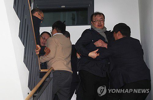 (서울=연합뉴스) 신준희 기자 = 14일 서울지방노동위원회에서 열린 특별조정위원회 2차 사후 조정회의에서 박점곤 서울시버스노동조합(버스노조) 위원장(왼쪽 두번째)과 조합원이 회의장을 나서자 회의 관계자들이 이를 만류하고 있다. 2026.1.14