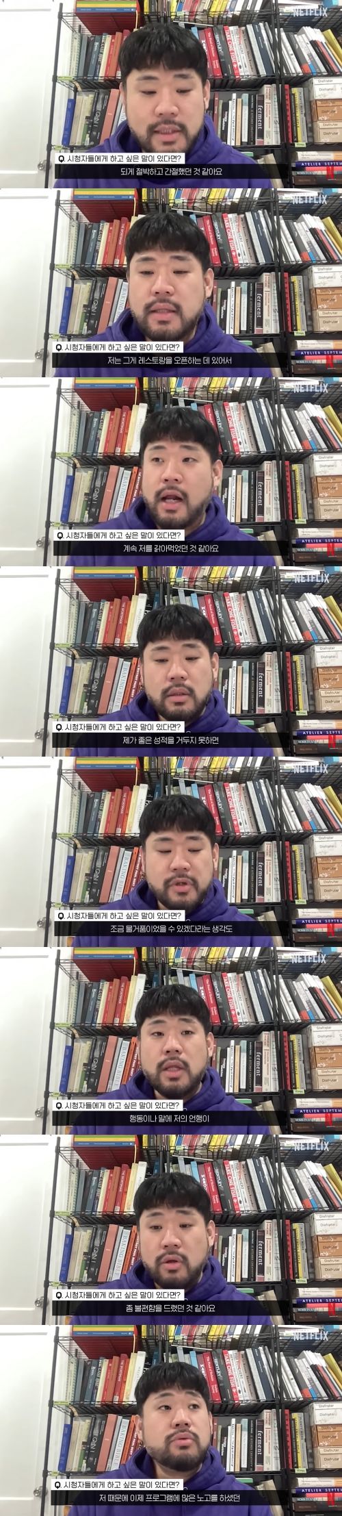 "시청자들에게 하고 싶은 말이 있다면?"이라는 질문에 "촬영하는 데 있어서 되게 절박하고 간절했던 것 같다. 그동안 좋은 식당에서 운이 좋게 일했다. 그게 레스토랑을 오픈하는데 있어서 또 연결이 돼서 큰 어려움없이 할 수 있을 줄 알았는데 그러지 않다는 생각이 계속 날 갉아먹었던 것 같다"며 "'내가 더 열심히 했어야 됐나? 더 노력을 안 했나?'라는 생각이 들었고, 이 촬영에서까지 만약에 내가 좋은 성적을 거두지 못하면 지금까지 했던 게 물거품이었을 수 있겠다라는 생각도 크게 들었던 것 같아서 행동이나 말에 나의 언행이 조금 더 세게 표현 됐었던 것 같다. 그로 인해서 많은 분들한테 좀 불편함을 드렸던 것 같다"며 진심으로 사과했다.