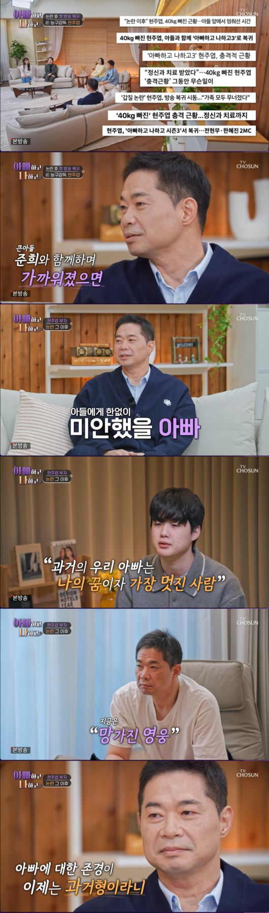 [OSEN=박근희 기자] '아빠하고 나하고 시즌3’ 방송인 현주엽이 근무태만 및 자녀 특혜 논란 이후 약 2년 만에 방송에 복귀하며, 그간 숨겨왔던 가족들의 아픔을 고백했다.