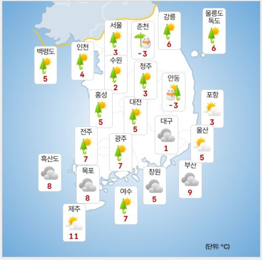전국 주요 도시별 예상 최저기온은 △서울 3도 △인천 4도 △춘천 -3도 △강릉 6도 △대전 5도 △대구 1도 △전주 7도 △광주 7도 △부산 9도 △제주 11도 △울릉도 독도 6도다.