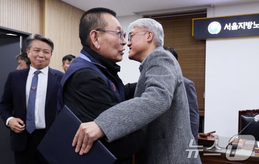 (서울=뉴스1) 박지혜 기자 = 14일 서울 영등포구 서울지방노동위원회에서 열린 특별조정위원회 2차 사후 조정회의에서 서울 시내버스 노사가 임금협상에 극적으로 합의한 뒤 박점곤 서울시버스노동조합 위원장과 김정환 서울시버스사업조합 이사장이 포옹을 하고 있다. 2026.1.15/뉴스1