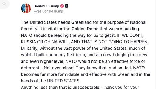 트럼프 대통령은 이날 자신의 소셜미디어 플랫폼 트루스 소셜에 "미국은 국가 안보를 위해 그린란드가 반드시 필요하다"며 "우리가 건설 중인 골든돔에 그린란드는 필수적인 존재"라고 적었다.