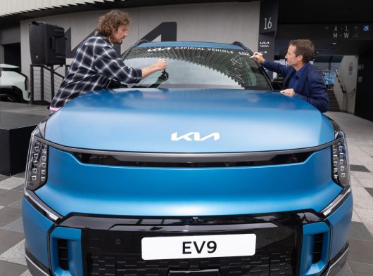 14일(현지 시간) 호주 빅토리아주의 기아 아레나 테라스에서 테니스 선수 마라트 사핀(왼쪽)과 기아 호주법인 앰배서더인 데이미언 올리버가 EV9에 사인을 남기고 있다. 기아는 파트너십을 맺은 2026 호주 오픈 테니스 대회에 EV9 등 총 130대를 지원한다. 기아 제공 Copyright Ⓒ 동아일보. All rights reserved. 무단 전재, 재배포 및 AI학습 이용 금지