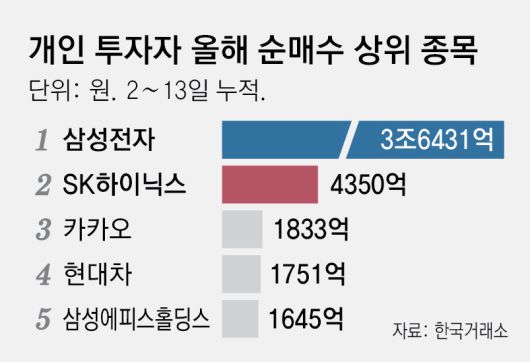 개인투자자들은 올해 들어 13일까지 코스피에서 1조 원 넘게 순매도했지만, 삼성전자는 3조6431억 원, SK하이닉스는 4350억 원 순매수했다. ‘반도체 투 톱’만 4조 원 넘게 사들인 셈이다. 특히 삼성전자는 올해 첫 거래일인 2일을 제외하고 매일 순매수했고, 지난해 두 배 넘게 오른 SK하이닉스의 경우 주가가 하락한 9일과 13일 5000억 원 이상씩 순매수했다. 주가가 계속 우상향할 것이라고 믿고 ‘똘똘한 한 종목’을 집중적으로 사들인 것으로 보인다.