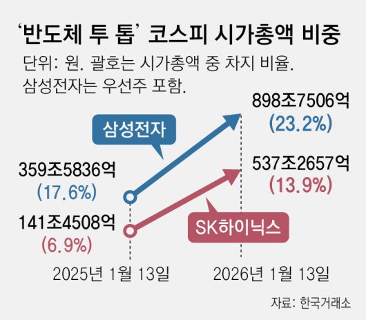 14일 한국거래소에 따르면 전날 종가 기준 코스피 시가총액은 3876조3979억 원으로 집계됐다. 삼성전자 시가총액(우선주 포함)이 898조7506억 원으로 23.2%에 달했다. 시총 2위 SK하이닉스 시총은 537조2657억 원으로 13.9%를 차지했다. 코스피에서 ‘반도체 투 톱’이 차지하는 비중은 37.1%로 1년 전(24.5%)보다 12.6%포인트 올랐다.
