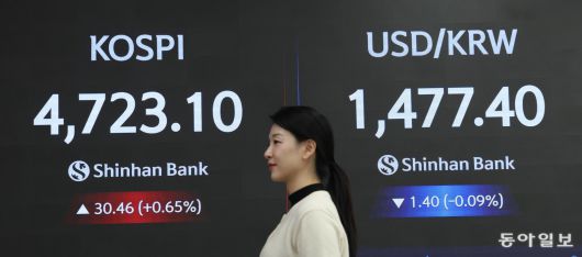 코스피 연일 ‘하이킥’… 4700선도 뚫었다 14일 서울 중구 신한은행 본점 전광판에 4,700 선을 돌파한 코스피 종가가 표시돼 있다. 종가 기준으로 코스피가 4,700을 넘어선 것은 처음이다. 김재명 기자 base@donga.com |